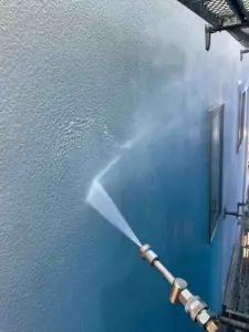 工事の初めにまず行うのが高圧洗浄です。汚れた外壁を150キロの水圧で洗い流していきます。高圧洗浄では外壁の汚れはもちろん、外壁に付着したカビや古い塗膜も一緒に洗い流します。この工程により表面が清潔になり、塗料が外壁に密着しやすくなります。また、塗膜の耐久性が向上し、塗料が均一に塗布されることで外観が美しくなります。塗膜の寿命が延び、塗料の効果が最大限に発揮されます。